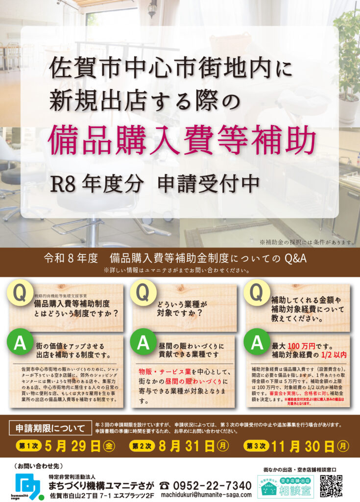 この制度は経営力に長けた事業者の佐賀市中心市街地への出店を、「備品購入費等補助」という形で支援する制度です。周辺波及効果のある「強い」店を、街なかに増やす目的で実施します。
